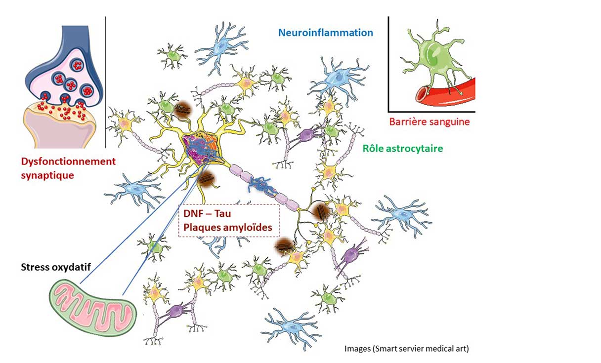 Le développement très progressif de ces deux lésions spécifiques est associé à des mécanismes pathologiques non spécifiques accélérant la souffrance et la mort neuronale : stress oxydant, neuroinflammation et altération des mitochondries.